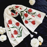 Experience the grace of a spring garden in motion. Our Tulip Waltz stoler is a celebration of femininity and timeless artistry, featuring bold, sweeping crimson tulips that appear to dance across a pristine ivory canvas.